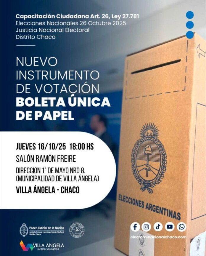 La Municipalidad de Villa Ángela invita a toda la comunidad a participar de la Capacitación Ciudadana sobre Boleta Única de Papel, que se llevará adelante el jueves 16 de octubre a las 18:00 en el Salón Ramón Freire.