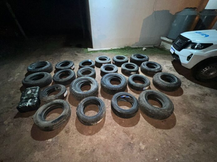 Cuando el vehículo fue inspeccionado, se encontraron 72 cubiertas nuevas, dos envoltorios con hojas de coca, 3.154 dólares, 422.420 pesos argentinos y un teléfono celular Samsung A15. Todos los elementos fueron secuestrados.