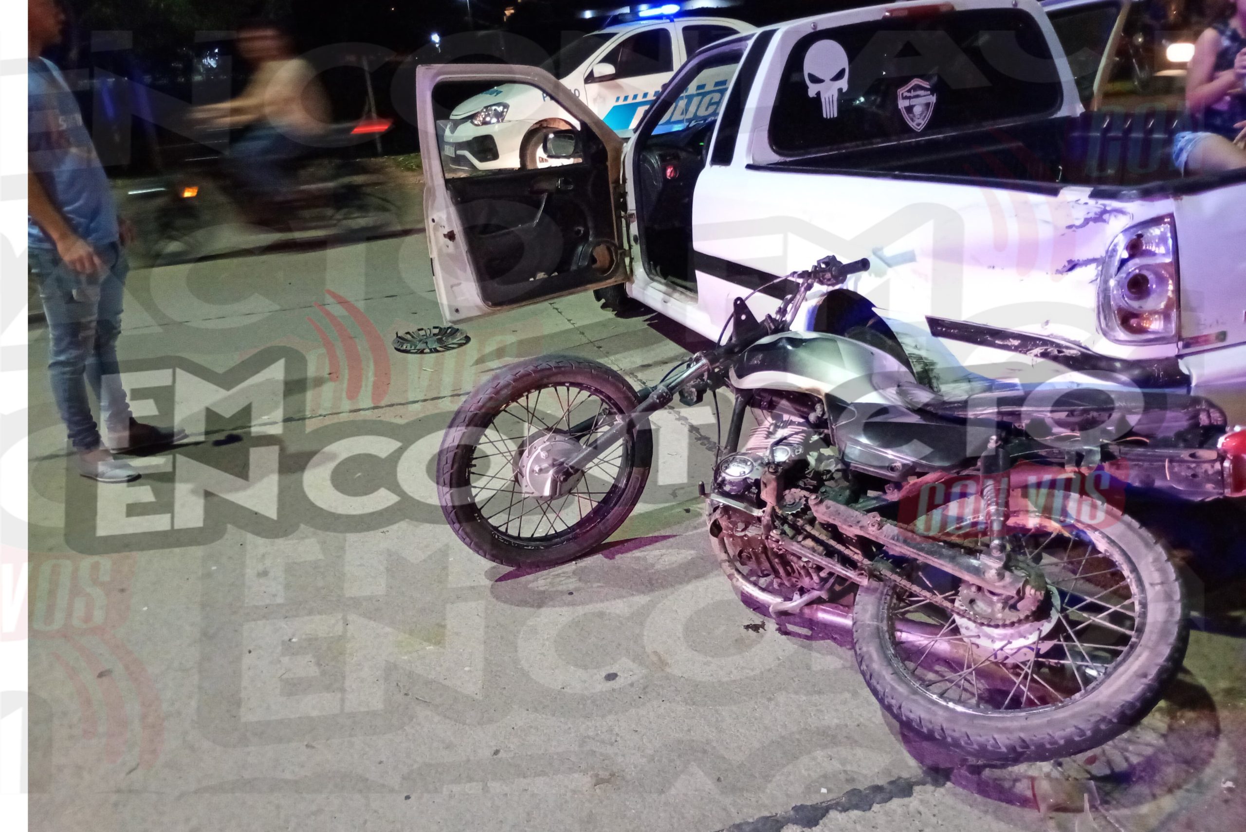 Un hombre de 31 años que conducía su camioneta Volkswagen – Saveiro acompañado por su pareja, manifestó que en un momento dado y por razones se tratan establecer es colisionado por dos dos motocicletas. Una era guiada por un menor de dieciséis años que terminó lesionado y la otra por un mayor de 19 acompañado por otro menor de dieciséis años. Arribó lugar ambulancia Hospital local, quienes trasladaron lesionados para atención.