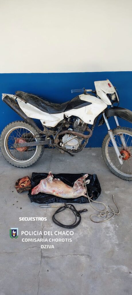 Ante esta información, los efectivos policiales iniciaron recorridas preventivas por la localidad, logrando interceptar a un joven de 22 años que se movilizaba en una motocicleta marca Motomel de 150 cc. El mismo transportaba una bolsa que contenía un cordero faenado, además de un cuchillo de 10 centímetros de hoja y una soga de aproximadamente 2 metros de largo.