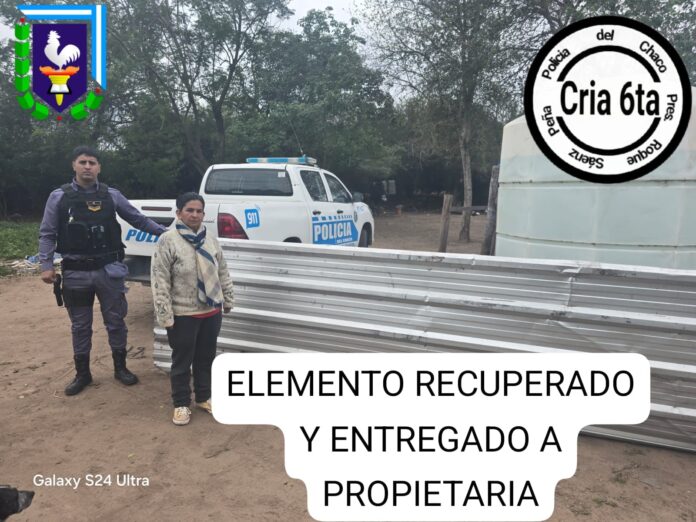 Una mujer de 43 años había denunciado el sábado pasado ante la Comisaría local, el hurto de una chapa de aproximadamente siete metros del patio de su vivienda ubicada en calle 47 del barrio Nestor Kirchner el cual desconoce cuando ocurrió el hecho.