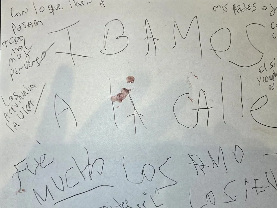 La hoja A4 horizontal se encontraba manchada de sangre y contenía frases inconexas sueltas como: «Fue mucho. Los amo. Lo siento.», «Íbamos a la calle», «Con lo que íbamos a pasar», «Todo mal, muy perverso» y «Les arruinaba la vida».