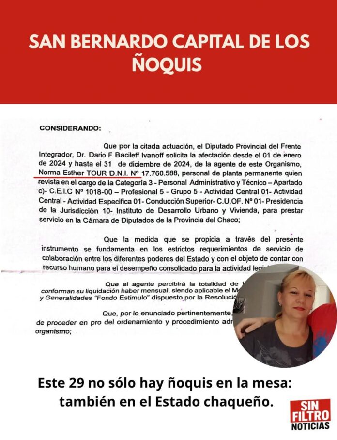 San Bernardo no deja de sorprendernos. Una vez más, la localidad aparece en el centro de la polémica por lo que muchos vecinos consideran un caso de “ñoqui” estatal. Se trata de una empleada de planta permanente del Instituto Provincial de Desarrollo Urbano y Vivienda, que habría sido asignada para trabajar en la Cámara de Diputados bajo la órbita de un legislador provincial, pero que, según testimonios, nunca se habría presentado a cumplir con sus funciones.