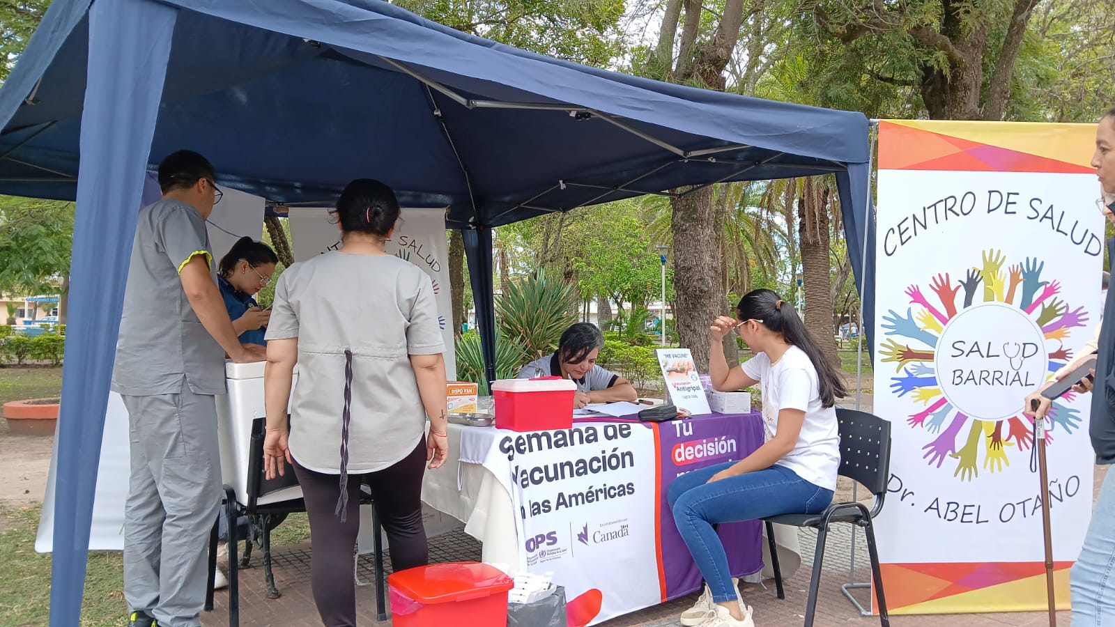 En esta primera instancia, profesionales de la salud realizaron la aplicación de dosis en un puesto sanitario instalado en el espacio público, permitiendo que vecinos que se acercaban al lugar pudieran vacunarse de manera gratuita.